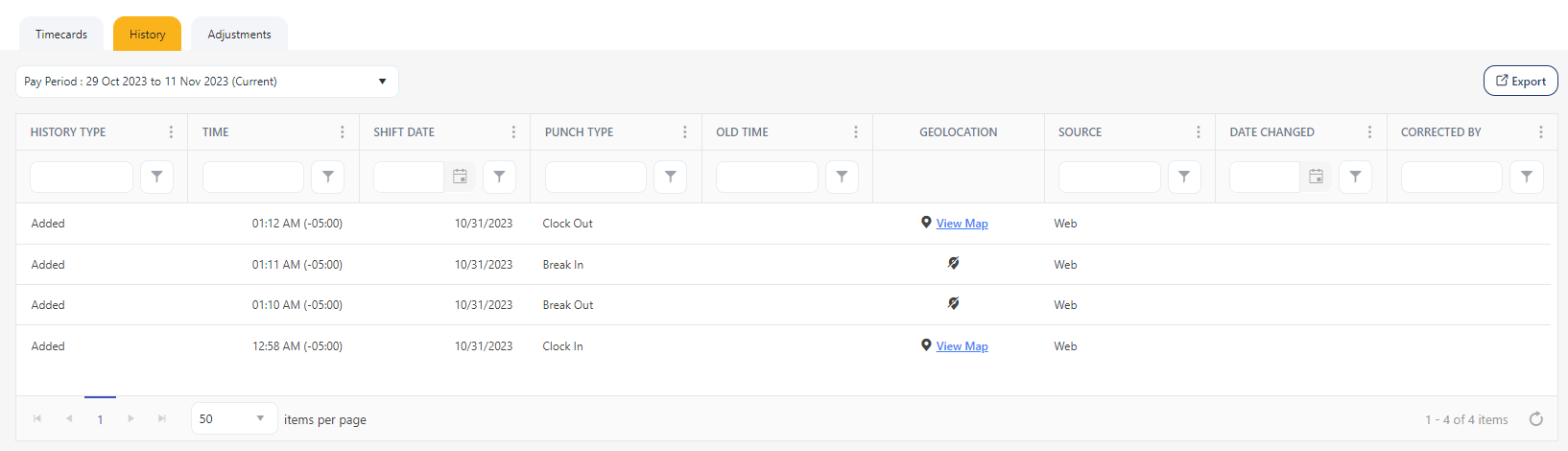 After the location access is granted and when you clock in or out, location information becomes accessible. To view the location information, go to the "Timecards > History tab" or "View Timecards > History tab" and click on the View Map link.