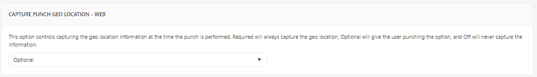 - Select Capture Punch Geo Location. The Capture Punch Geo Location settings allow for capturing the geo location information when performing a punch. Select the option: