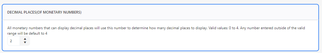 This option allows you to set the number of decimal places to display in monetary numbers (where possible).