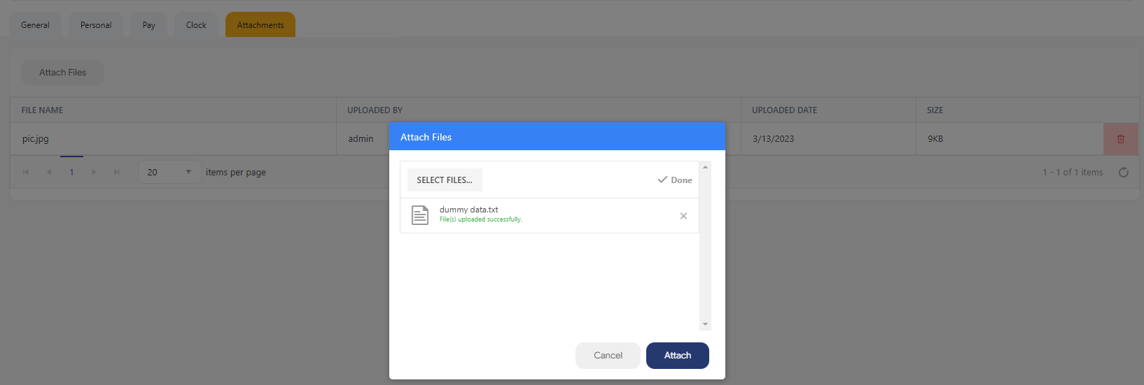 The Attachment tab is to attach any employee related documents. This tab also stores the display picture attached on the General tab.