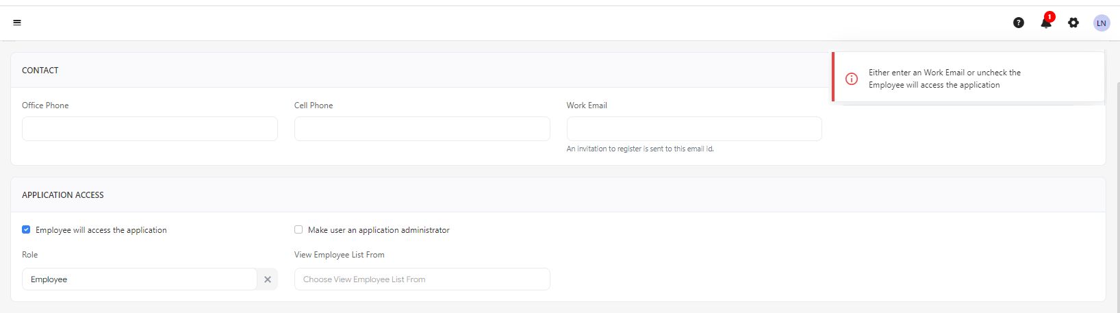Note that unchecking the checkbox will hide all the fields that appear in the application access section. The following fields appear if the "Employee will access the application" checkbox is enabled.