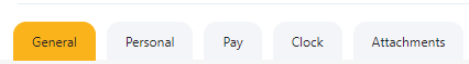 Add Employee screen has 6 tabs - General, Personal, Pay, Clock, and Attachments.