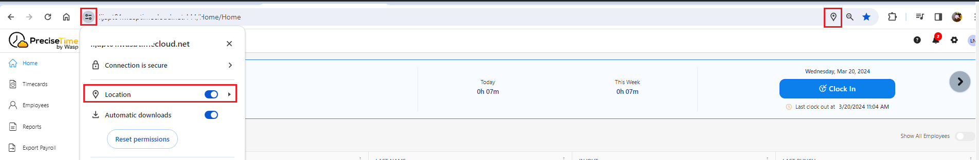 - Upon granting permission to add location data to each punch, the address bar of the browser will display the geolocation icon. Conversely, when disabled, it will either hide or show a geolocation icon with a line over it (
