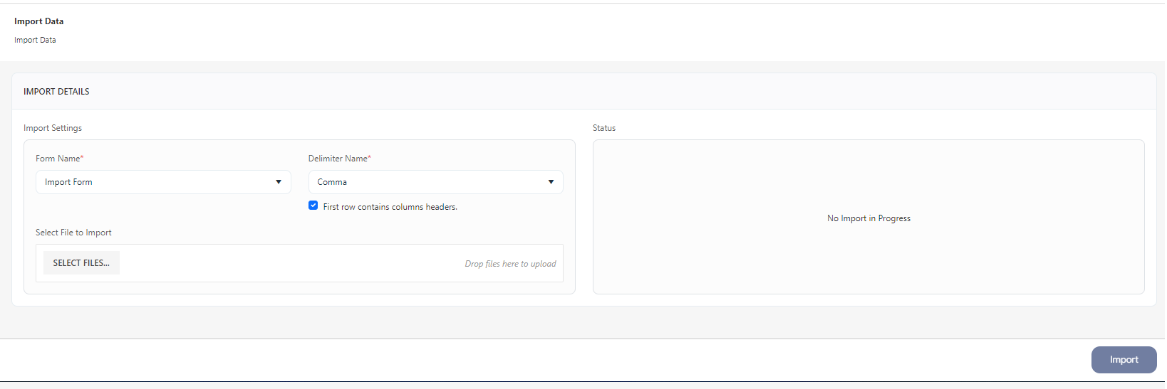 - Select File to Import - Click on the Select Files button to upload the CSV file.