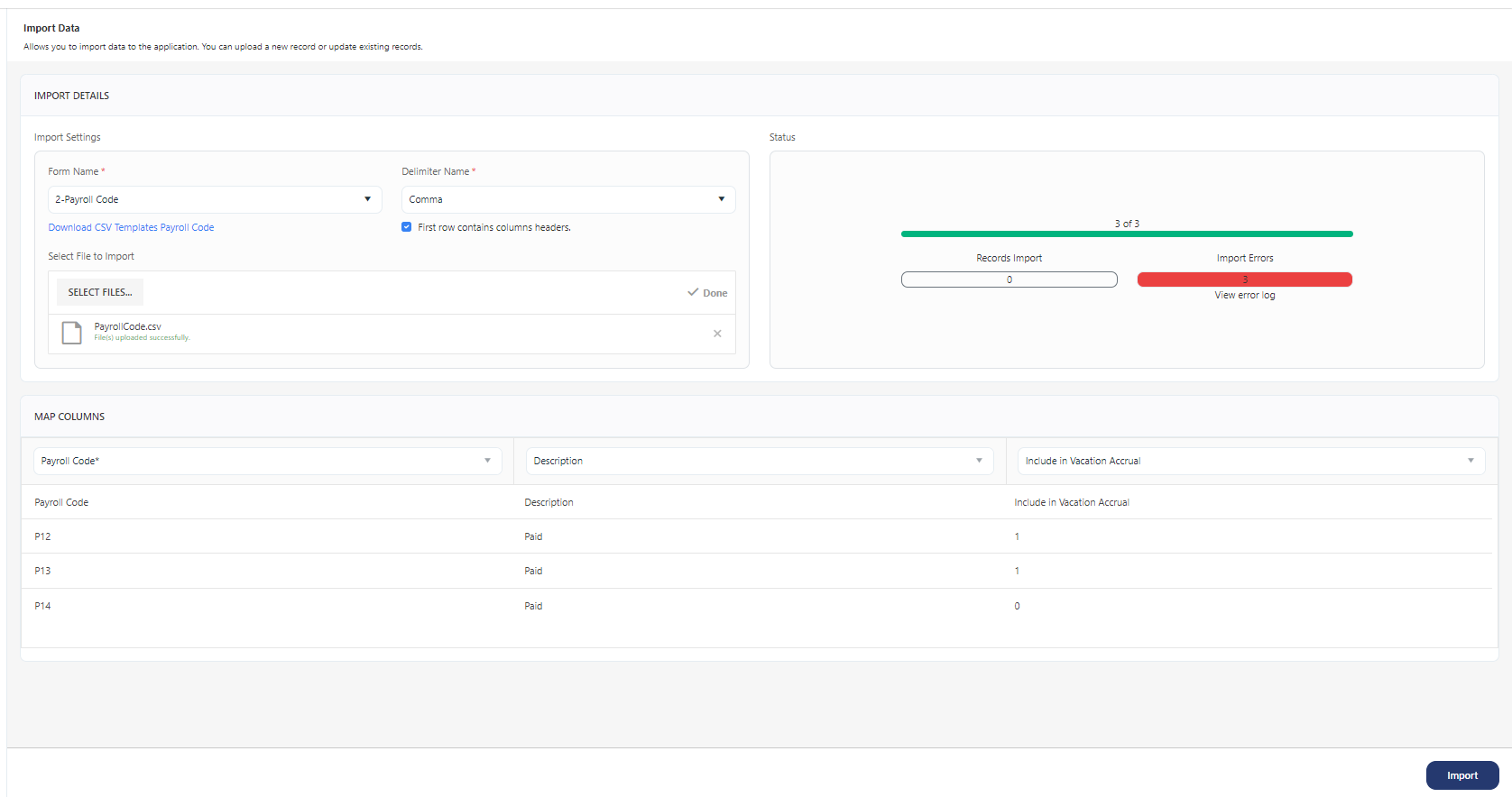 - Check the Status to see if the import was successful or not. Check the error log if you see Import Errors. If there are any errors, fix the errors.
