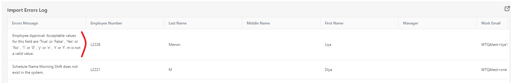 - Note that the acceptable choices for the columns containing fields requiring actions such as enabling/disabling, or selecting/deselecting specific functionalities include 'True' or 'False', 'Yes' or 'No', '1' or '0', 'y' or 'n', and 't' or 'f'. The Import Error Log will also show this message.