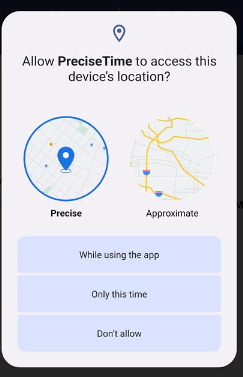 - Example - To verify, consider that the capture punch geo location is set to "Required". Access the mobile application. Try to Clock In. A popup message will appear with the message "Allow PreciseTime to access this device's location? - While Using the app, Only this time, or Don't allow".