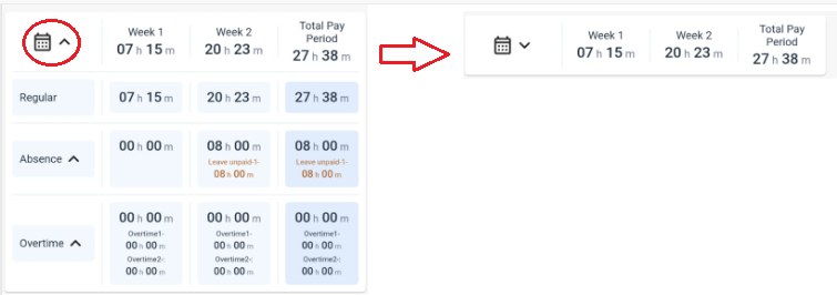 - The first row presents the total hours worked for each week and the overall total for the pay period. You can use the arrow next to the calendar icon to hide the information related to the regular hours, absences, and overtime hours.