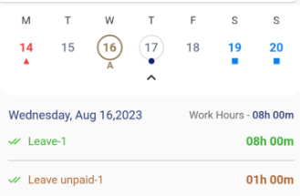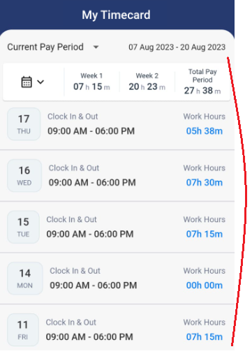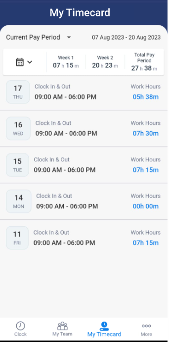 - Date-wise summary of worked hours - It will list the date, schedule, in-out time, and worked hours. Each row is clickable and will navigate to the timecard screen where you can view the complete details.