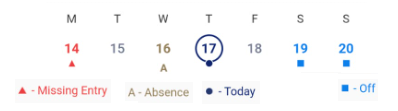 - Calendar - The Calendar gives a preview of total hours, days with missed punches, absences, and off days.