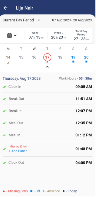 - Selected date time entries - By default, the current date will be selected and it will display all the in/out time including meal and break time.