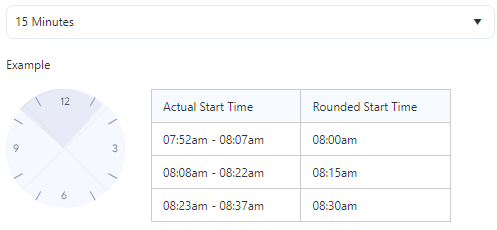 - Example: If the "Round To" was set to 15 (minutes), and the "Round-Up After" was set to 7, the following rules would apply: An employee clocks in at 7:51 - time is rounded to 7:45. An employee clocks in at 7:52 - time is rounded up to 8:00 (7:45 + 7 minutes). This rounding happens on the final calculation of the time. The actual clock in and out times will be shown on the timecard.