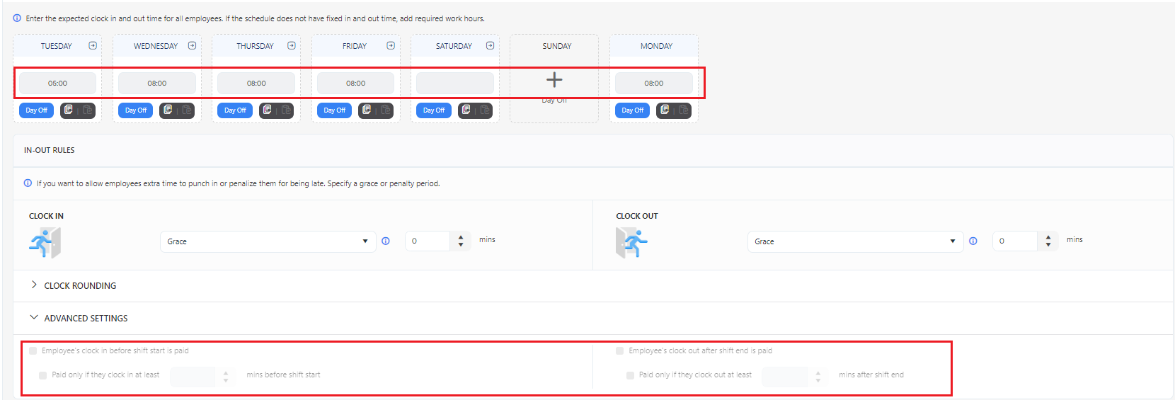 Enter the expected clock in and out time for all employees. Add the required work hours if the schedule does not have fixed in and out time. Note that you can set the first day of the week in the Pay Period Settings screen.