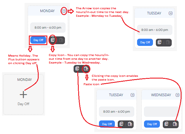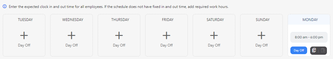 - Initially, you will see a Plus button on all days. The Plus button indicates Day Off.