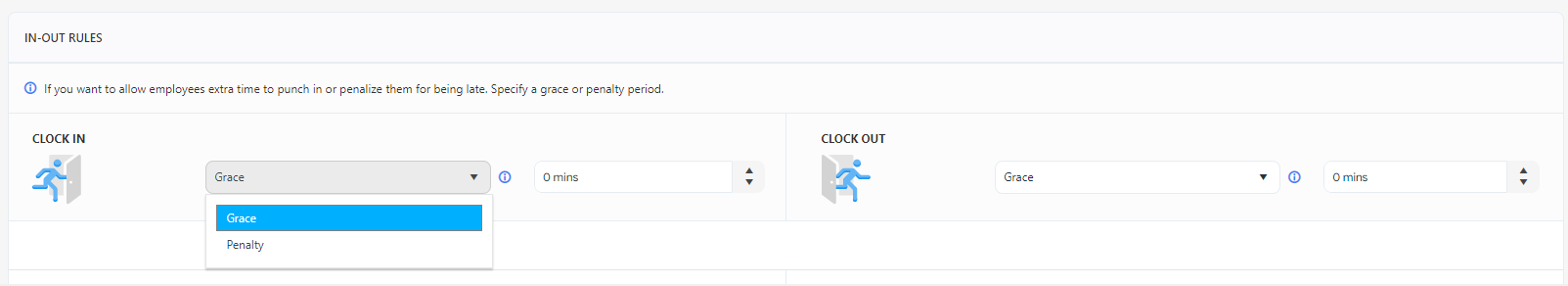 - Grace Period - Select "Grace" from the dropdown options and enter the grace period in minutes. This applies to both clock in and clock out.