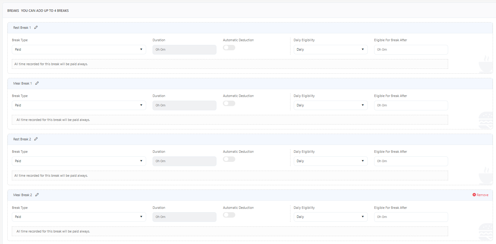 - Meal Break 2 can be added only after adding Rest Break 2. Add Rest Break 2 and then click on + Meal Break 2 to add one more meal break.