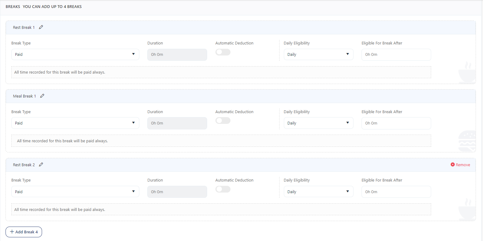 - The Rest Break 2 can be added only after adding Meal Break 1. Add Meal Break 1 and then click on + Rest Break 2 to add one more rest break.