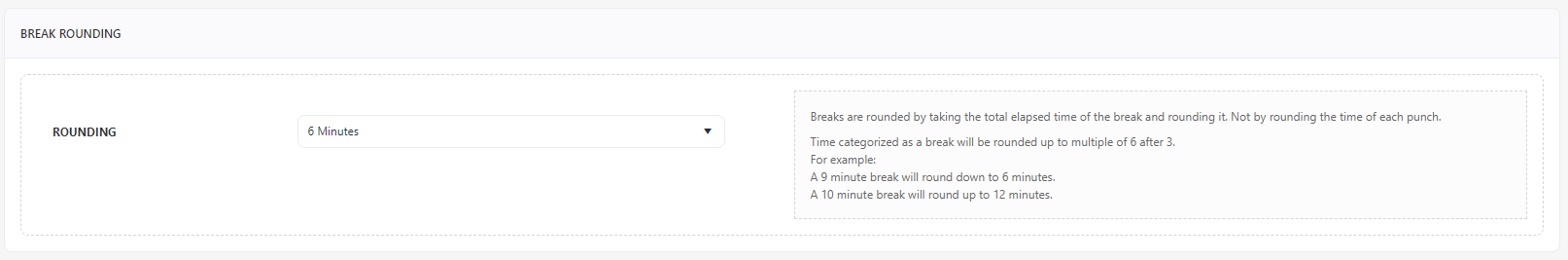 - Break Rounding - Select the rounding options. The options are - None, 15 minutes, 6 minutes, 5 minutes, and Custom. The related topic is Rounding > Rounding Options.
