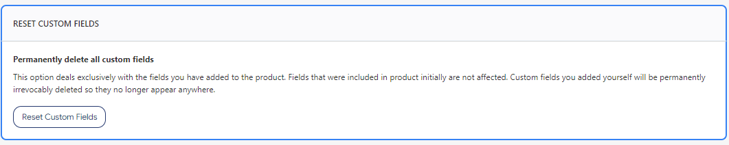 - Reset Custom Fields - This option is dedicated to removing all custom fields, ensuring that only the custom fields you added to the product are affected. Fields that were originally part of the product will remain untouched. Any custom fields you have added will be irreversibly and permanently erased, ensuring they no longer appear anywhere.