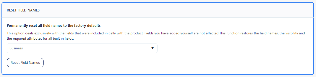 - Reset Field Names - This option results in a permanent reset of all field names back to their factory defaults. It exclusively pertains to the fields that were initially included in the product. Any fields you've added independently remain unaffected. This function restores the field names, visibility settings, and required attributes to their original values for all built-in fields.