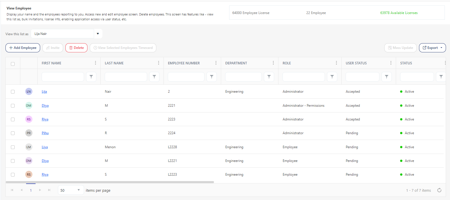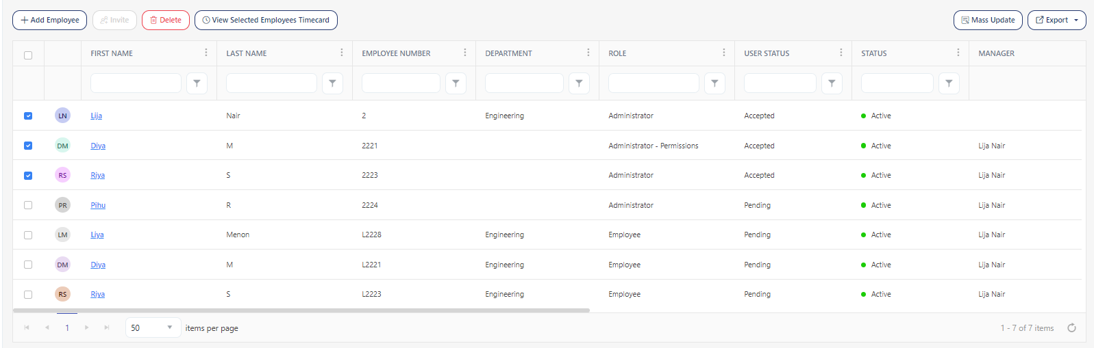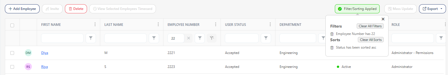 - User Status - The Employee status includes Accepted, Pending, Not Invited, and Denied.