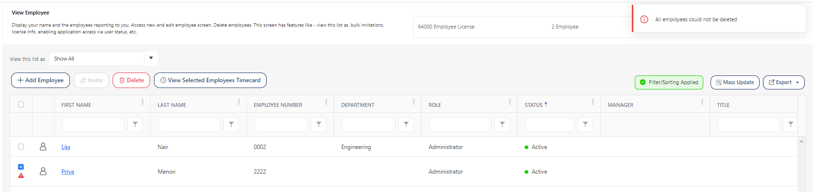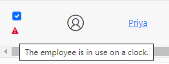 Note: The following employee (or employees) cannot be deleted - who are in use as a manager, who “Has Application Access” checked (the check needs to be removed to delete an employee), in an unprocessed punch, has clock assignment, is on a schedule, etc. In these scenarios, you will get a message and an alert icon next to an employee showing that the employee is in use and cannot be deleted.