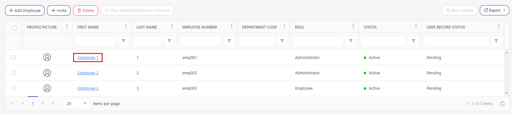 - Edit - To edit an employee's information, click on the Employee's first name. The first name is a link that will navigate to the View/Edit Employee screen. Refer to the Edit Employee topic for more details.