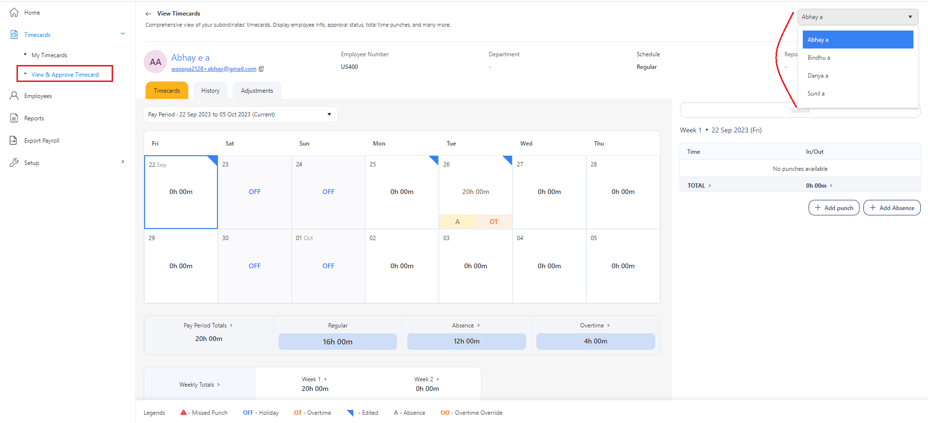 - To view another employee's timecard, use the navigation arrow or dropdown menu at the top right.