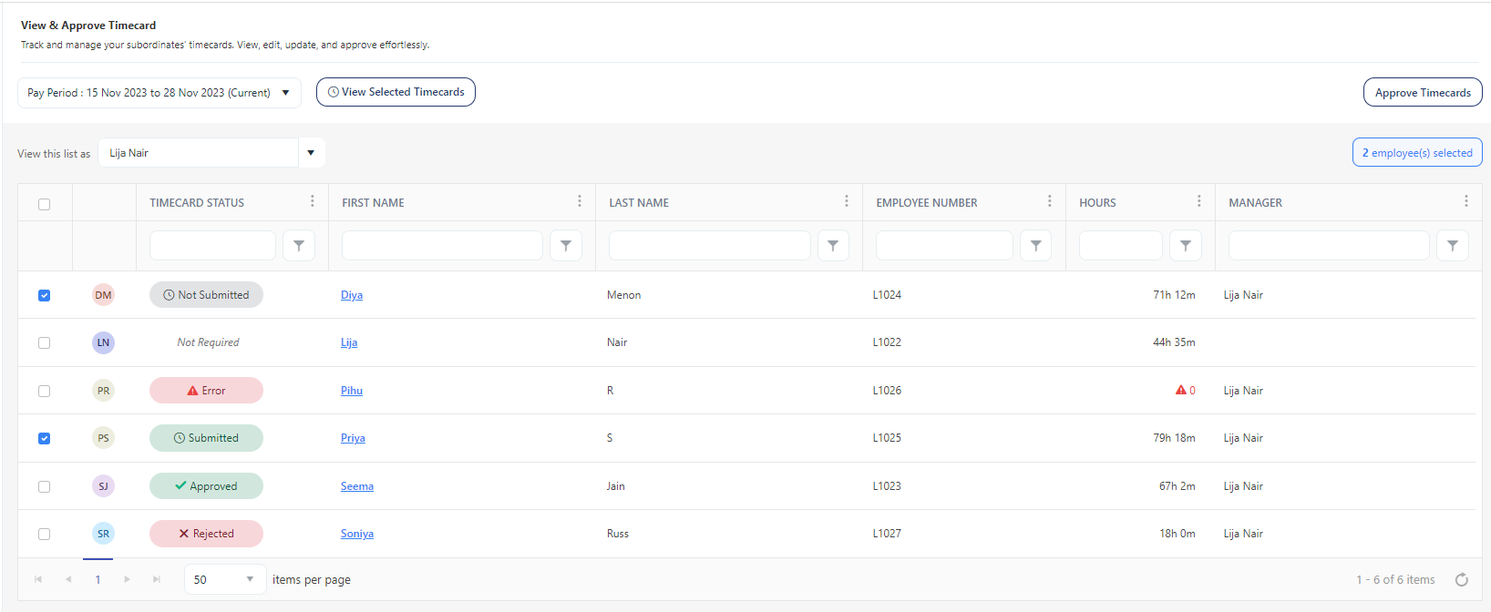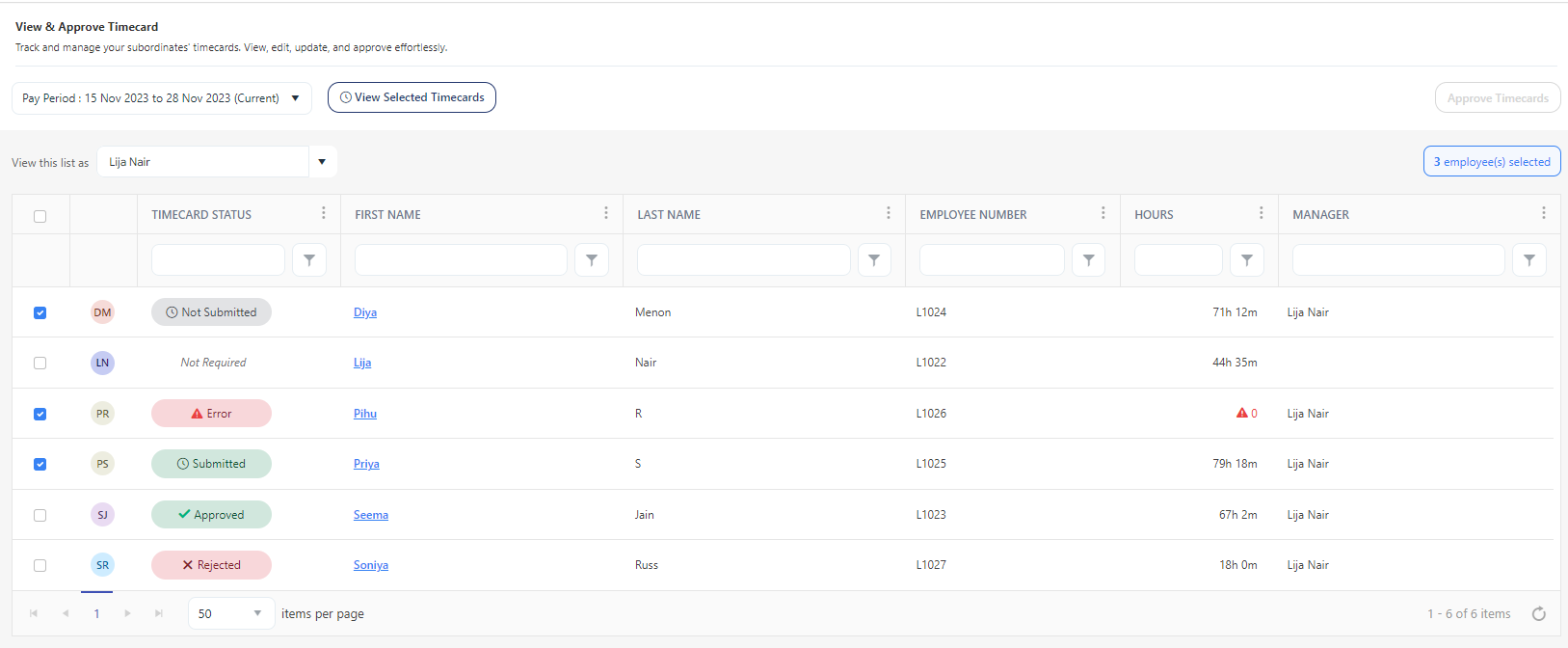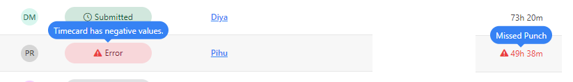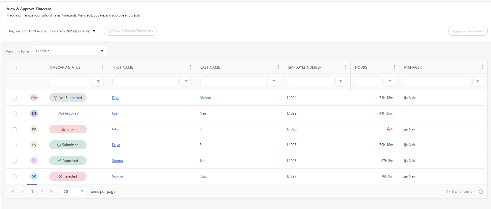 The View Timecards screen on the View and Approve Timecards lists subordinates reporting to you. It will display their names, employee number, timecard status, and hours. Any discrepancies in the total hour will be shown in red color with a  symbol. You can also approve timecards with no discrepancies from the view screen itself.