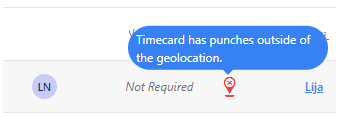 9. Geofence - The geofence () icon will be shown next to the "timecard status column" for the employees who have punches recorded outside the designated geofence area. The Geofence feature records the punch location and notifies the user by displaying an icon and a hover message on the timecard, indicating that the punch occurred outside the designated area. You can view the details on the View Timecard screen.