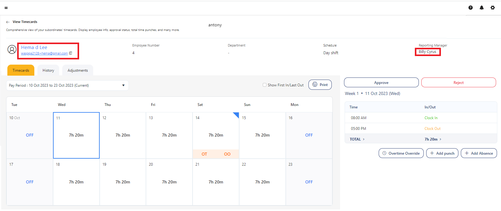 1. Consider that Billy is on leave and Antony is assigned to approve Hema's timecard.